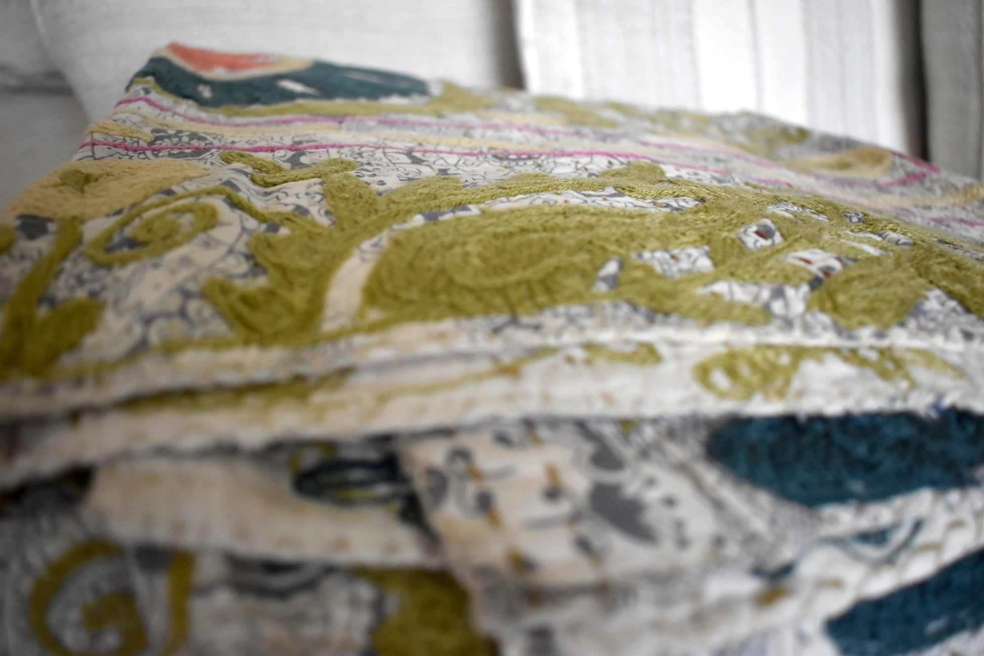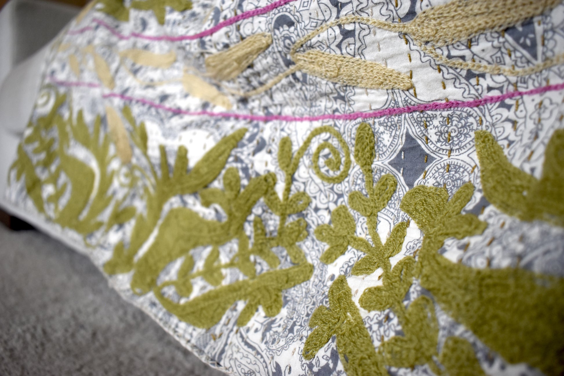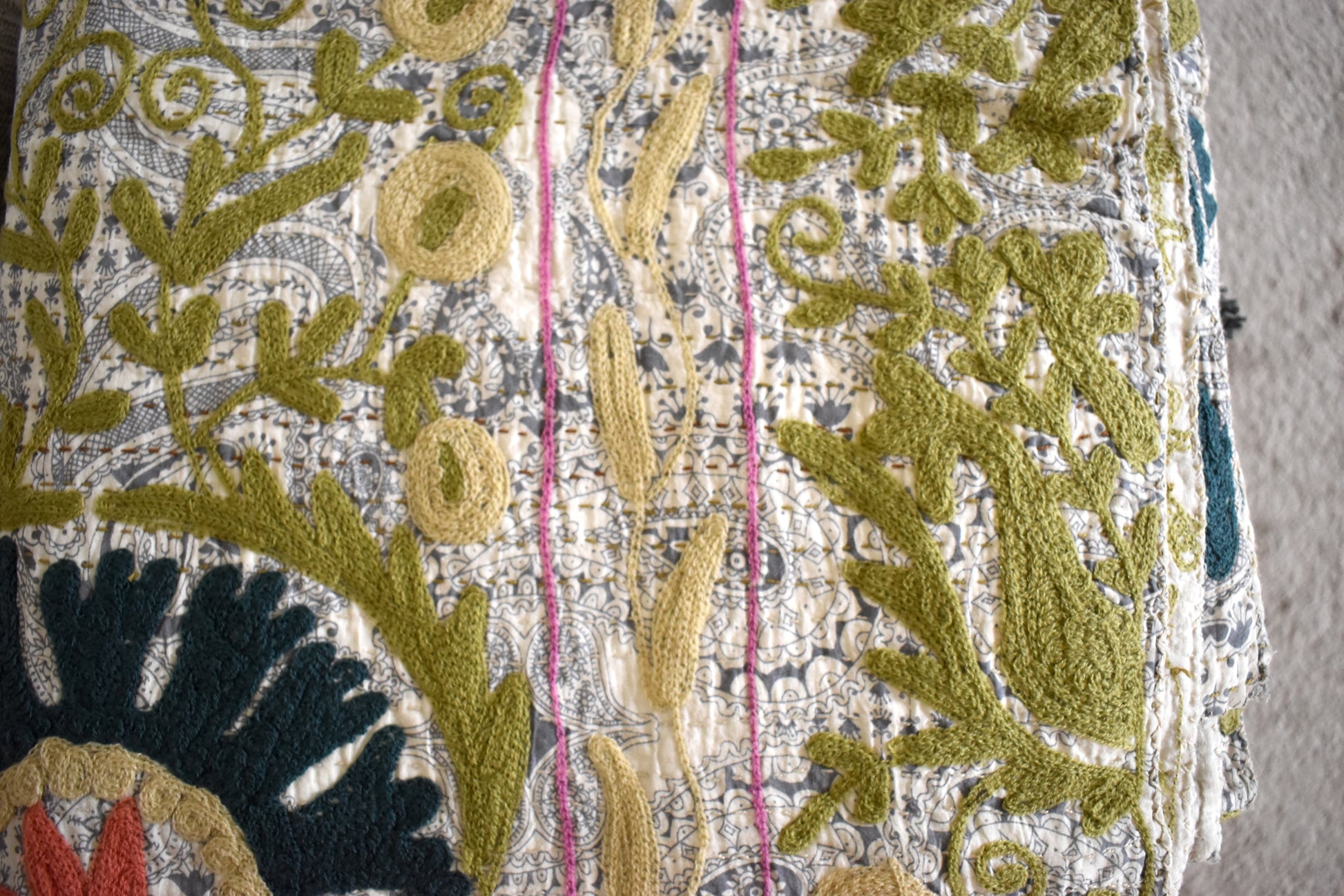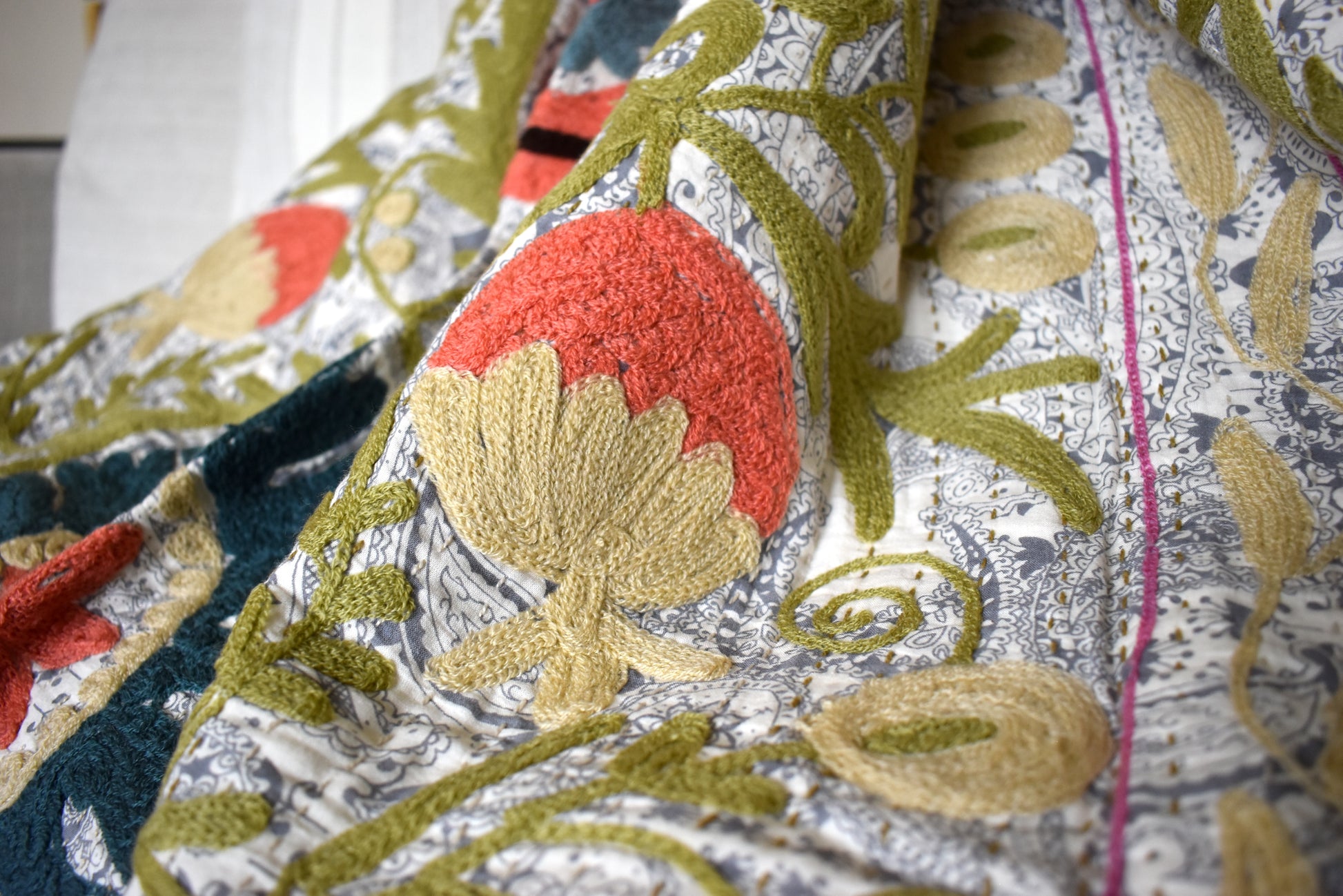 Product Description: Printed Throw with with beautiful embroidery. A mix of contemporary and traditional artistic cover for your sofa, bed or a chair made on a printed fabric with contemporary embroidery. A perfect companion to your home adding the panache to a cozy corner.